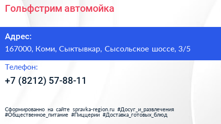 Гольфстрим, автомойка по адресу 167000, Коми, Сыктывкар, Сысольское шоссе, 3/5 в дальнейшем Организация, размещена в следующих категориях: