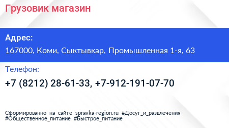 Грузовик, магазин по адресу 167000, Коми, Сыктывкар, Промышленная 1-я, 63 в дальнейшем Организация, размещена в следующих категориях: