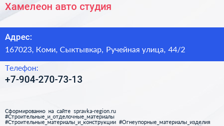 Хамелеон, авто-студия по адресу 167023, Коми, Сыктывкар, Ручейная улица, 44/2 в дальнейшем Организация, размещена в следующих категориях: