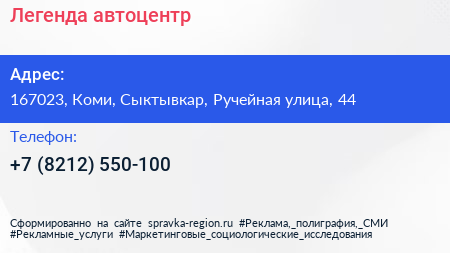 Легенда, автоцентр по адресу 167023, Коми, Сыктывкар, Ручейная улица, 44 в дальнейшем Организация, размещена в следующих категориях: