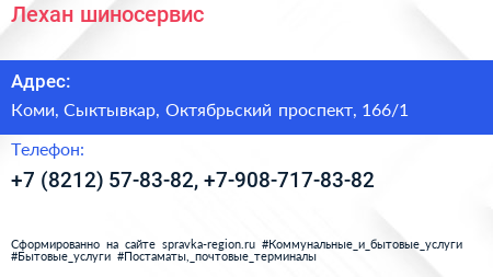 Лехан, шиносервис по адресу Коми, Сыктывкар, Октябрьский проспект, 166/1 в дальнейшем Организация, размещена в следующих категориях: