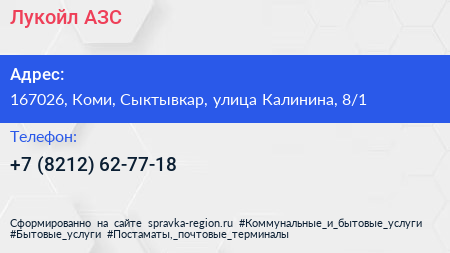 Лукойл, АЗС по адресу 167026, Коми, Сыктывкар, улица Калинина, 8/1 в дальнейшем Организация, размещена в следующих категориях: