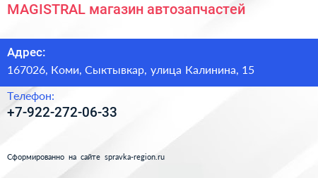 MAGISTRAL, магазин автозапчастей по адресу 167026, Коми, Сыктывкар, улица Калинина, 15 в дальнейшем Организация, размещена в следующих категориях: