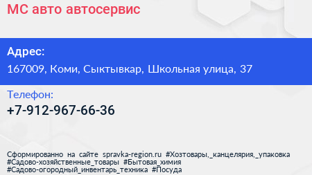 МС авто, автосервис по адресу 167009, Коми, Сыктывкар, Школьная улица, 37 в дальнейшем Организация, размещена в следующих категориях: