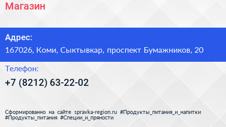 Магазин по адресу 167026, Коми, Сыктывкар, проспект Бумажников, 20 в дальнейшем Организация, размещена в следующих категориях: