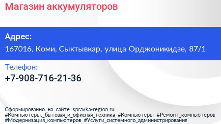 Магазин аккумуляторов по адресу 167016, Коми, Сыктывкар, улица Орджоникидзе, 87/1 в дальнейшем Организация, размещена в следующих категориях: