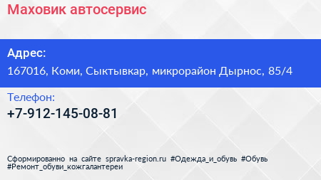 Маховик, автосервис по адресу 167016, Коми, Сыктывкар, микрорайон Дырнос, 85/4 в дальнейшем Организация, размещена в следующих категориях: