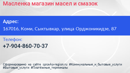Масленка, магазин масел и смазок по адресу 167016, Коми, Сыктывкар, улица Орджоникидзе, 87 в дальнейшем Организация, размещена в следующих категориях: