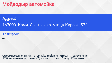 Мойдодыр, автомойка по адресу 167000, Коми, Сыктывкар, улица Кирова, 57/1 в дальнейшем Организация, размещена в следующих категориях: