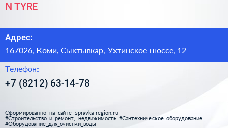 N-TYRE по адресу 167026, Коми, Сыктывкар, Ухтинское шоссе, 12 в дальнейшем Организация, размещена в следующих категориях: