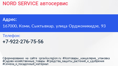 NORD SERVICE, автосервис по адресу 167000, Коми, Сыктывкар, улица Орджоникидзе, 93 в дальнейшем Организация, размещена в следующих категориях: