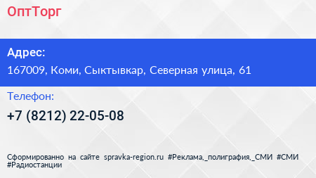 ОптТорг по адресу 167009, Коми, Сыктывкар, Северная улица, 61 в дальнейшем Организация, размещена в следующих категориях: