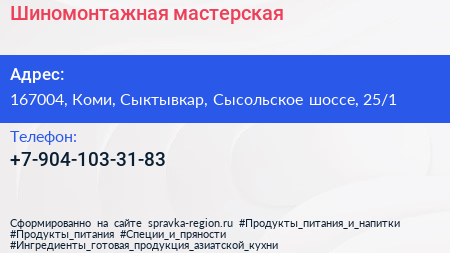 Шиномонтажная мастерская по адресу 167004, Коми, Сыктывкар, Сысольское шоссе, 25/1 в дальнейшем Организация, размещена в следующих категориях:
