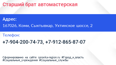 Старший брат, автомастерская по адресу 167026, Коми, Сыктывкар, Ухтинское шоссе, 2 в дальнейшем Организация, размещена в следующих категориях: