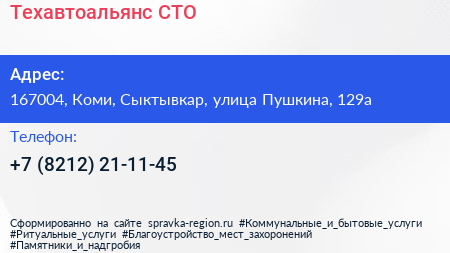 Техавтоальянс, СТО по адресу 167004, Коми, Сыктывкар, улица Пушкина, 129а в дальнейшем Организация, размещена в следующих категориях: