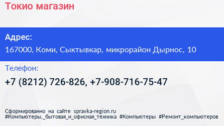 Токио, магазин по адресу 167000, Коми, Сыктывкар, микрорайон Дырнос, 10 в дальнейшем Организация, размещена в следующих категориях: