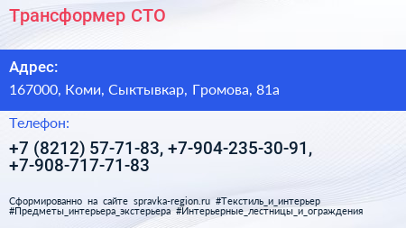 Трансформер, СТО по адресу 167000, Коми, Сыктывкар, Громова, 81а в дальнейшем Организация, размещена в следующих категориях: