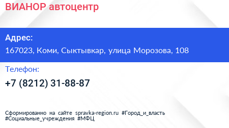 ВИАНОР, автоцентр по адресу 167023, Коми, Сыктывкар, улица Морозова, 108 в дальнейшем Организация, размещена в следующих категориях: