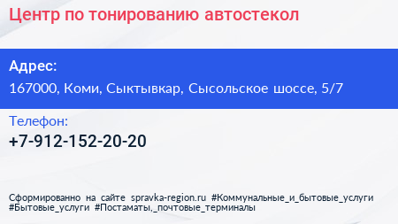 Центр по тонированию автостекол по адресу 167000, Коми, Сыктывкар, Сысольское шоссе, 5/7 в дальнейшем Организация, размещена в следующих категориях: