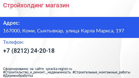 Стройхолдинг, магазин по адресу 167000, Коми, Сыктывкар, улица Карла Маркса, 197 в дальнейшем Организация, размещена в следующих категориях:
