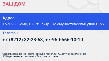 ВАШ ДОМ по адресу 167023, Коми, Сыктывкар, Коммунистическая улица, 65 в дальнейшем Организация, размещена в следующих категориях: