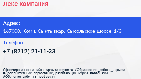 Лекс, компания по адресу 167000, Коми, Сыктывкар, Сысольское шоссе, 1/3 в дальнейшем Организация, размещена в следующих категориях:
