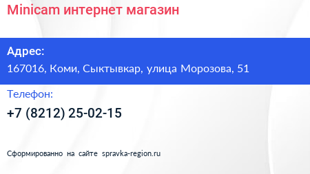 Minicam, интернет-магазин по адресу 167016, Коми, Сыктывкар, улица Морозова, 51 в дальнейшем Организация, размещена в следующих категориях: