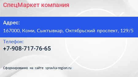 СпецМаркет, компания по адресу 167000, Коми, Сыктывкар, Октябрьский проспект, 129/5 в дальнейшем Организация, размещена в следующих категориях: