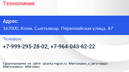 Технолиния по адресу 167000, Коми, Сыктывкар, Первомайская улица, 87 в дальнейшем Организация, размещена в следующих категориях: