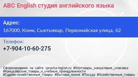 ABC English, студия английского языка по адресу 167000, Коми, Сыктывкар, Первомайская улица, 62 в дальнейшем Организация, размещена в следующих категориях: