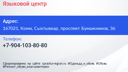 Языковой центр по адресу 167021, Коми, Сыктывкар, проспект Бумажников, 36 в дальнейшем Организация, размещена в следующих категориях: