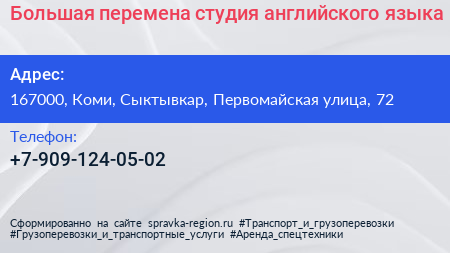 Большая перемена, студия английского языка по адресу 167000, Коми, Сыктывкар, Первомайская улица, 72 в дальнейшем Организация, размещена в следующих категориях: