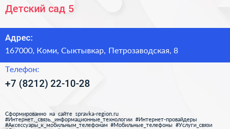 Детский сад №5 по адресу 167000, Коми, Сыктывкар, Петрозаводская, 8 в дальнейшем Организация, размещена в следующих категориях: