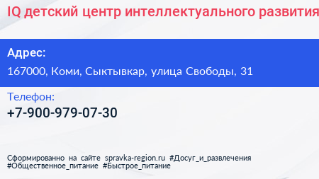 IQ, детский центр интеллектуального развития по адресу 167000, Коми, Сыктывкар, улица Свободы, 31 в дальнейшем Организация, размещена в следующих категориях: