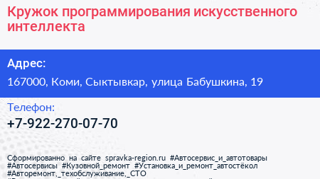 Кружок программирования искусственного интеллекта по адресу 167000, Коми, Сыктывкар, улица Бабушкина, 19 в дальнейшем Организация, размещена в следующих категориях: