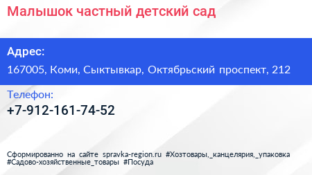 Малышок, частный детский сад по адресу 167005, Коми, Сыктывкар, Октябрьский проспект, 212 в дальнейшем Организация, размещена в следующих категориях:
