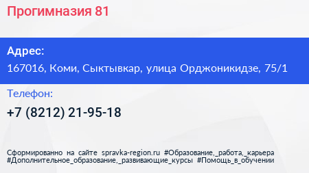 Прогимназия №81 по адресу 167016, Коми, Сыктывкар, улица Орджоникидзе, 75/1 в дальнейшем Организация, размещена в следующих категориях:
