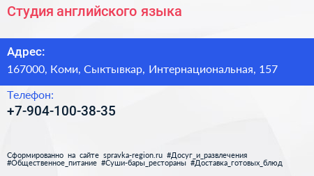 Студия английского языка по адресу 167000, Коми, Сыктывкар, Интернациональная, 157 в дальнейшем Организация, размещена в следующих категориях:
