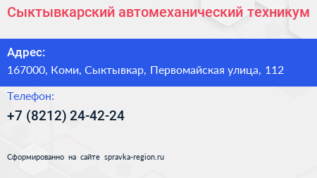 Сыктывкарский автомеханический техникум по адресу 167000, Коми, Сыктывкар, Первомайская улица, 112 в дальнейшем Организация, размещена в следующих категориях: