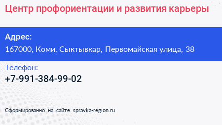 Центр профориентации и развития карьеры по адресу 167000, Коми, Сыктывкар, Первомайская улица, 38 в дальнейшем Организация, размещена в следующих категориях: