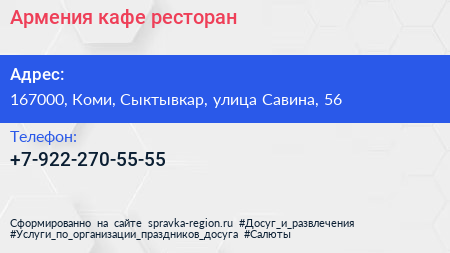 Армения, кафе-ресторан по адресу 167000, Коми, Сыктывкар, улица Савина, 56 в дальнейшем Организация, размещена в следующих категориях: