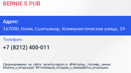 BERNIE`S PUB по адресу 167000, Коми, Сыктывкар, Коммунистическая улица, 19 в дальнейшем Организация, размещена в следующих категориях: