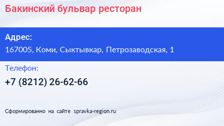 Бакинский бульвар, ресторан по адресу 167005, Коми, Сыктывкар, Петрозаводская, 1 в дальнейшем Организация, размещена в следующих категориях: