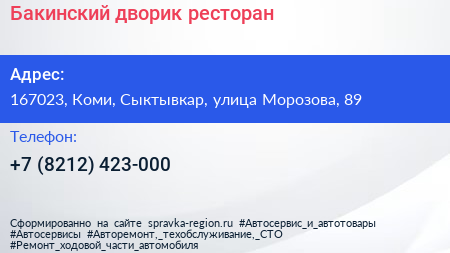 Бакинский дворик, ресторан по адресу 167023, Коми, Сыктывкар, улица Морозова, 89 в дальнейшем Организация, размещена в следующих категориях: