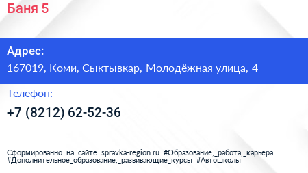 Баня №5 по адресу 167019, Коми, Сыктывкар, Молодёжная улица, 4 в дальнейшем Организация, размещена в следующих категориях: