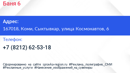 Баня №6 по адресу 167018, Коми, Сыктывкар, улица Космонавтов, 6 в дальнейшем Организация, размещена в следующих категориях: