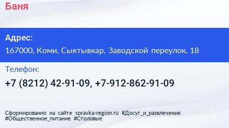 Баня по адресу 167000, Коми, Сыктывкар, Заводской переулок, 18 в дальнейшем Организация, размещена в следующих категориях: