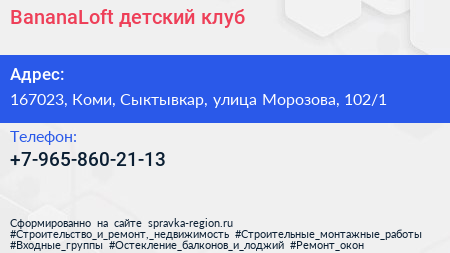 BananaLoft, детский клуб по адресу 167023, Коми, Сыктывкар, улица Морозова, 102/1 в дальнейшем Организация, размещена в следующих категориях: