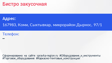 Бистро, закусочная по адресу 167983, Коми, Сыктывкар, микрорайон Дырнос, 97/1 в дальнейшем Организация, размещена в следующих категориях: