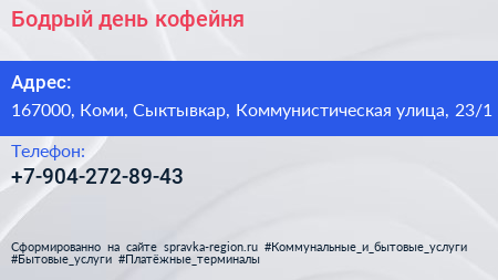 Бодрый день, кофейня по адресу 167000, Коми, Сыктывкар, Коммунистическая улица, 23/1 в дальнейшем Организация, размещена в следующих категориях: